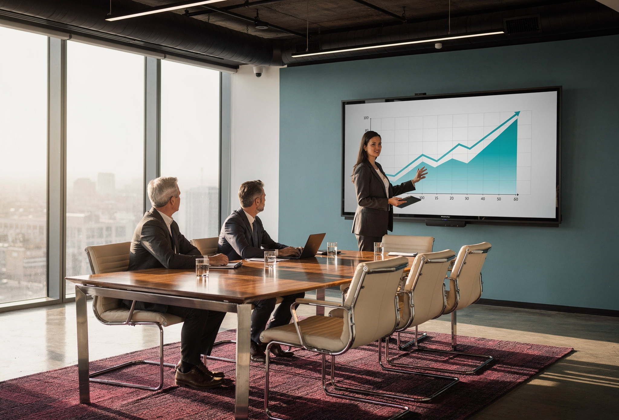 Yonetim kurulu toplantisinda strateji sunumu yapan danisman
